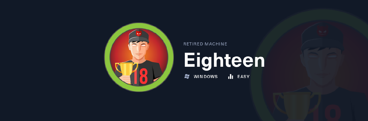Eighteen is an easy flagged machine, which I would rather give a medium to hard rating. Not only do you need fully understand some MSSQL enumeration and exploit paths, there are also some rabbit holes (website) and the machine is rather locked down with only three ports open. Privilege escalation as well is no easy path, if you do not understand core concepts of Kerberos and stayed up to date in recent exploits for on bleeding edge windows versions.